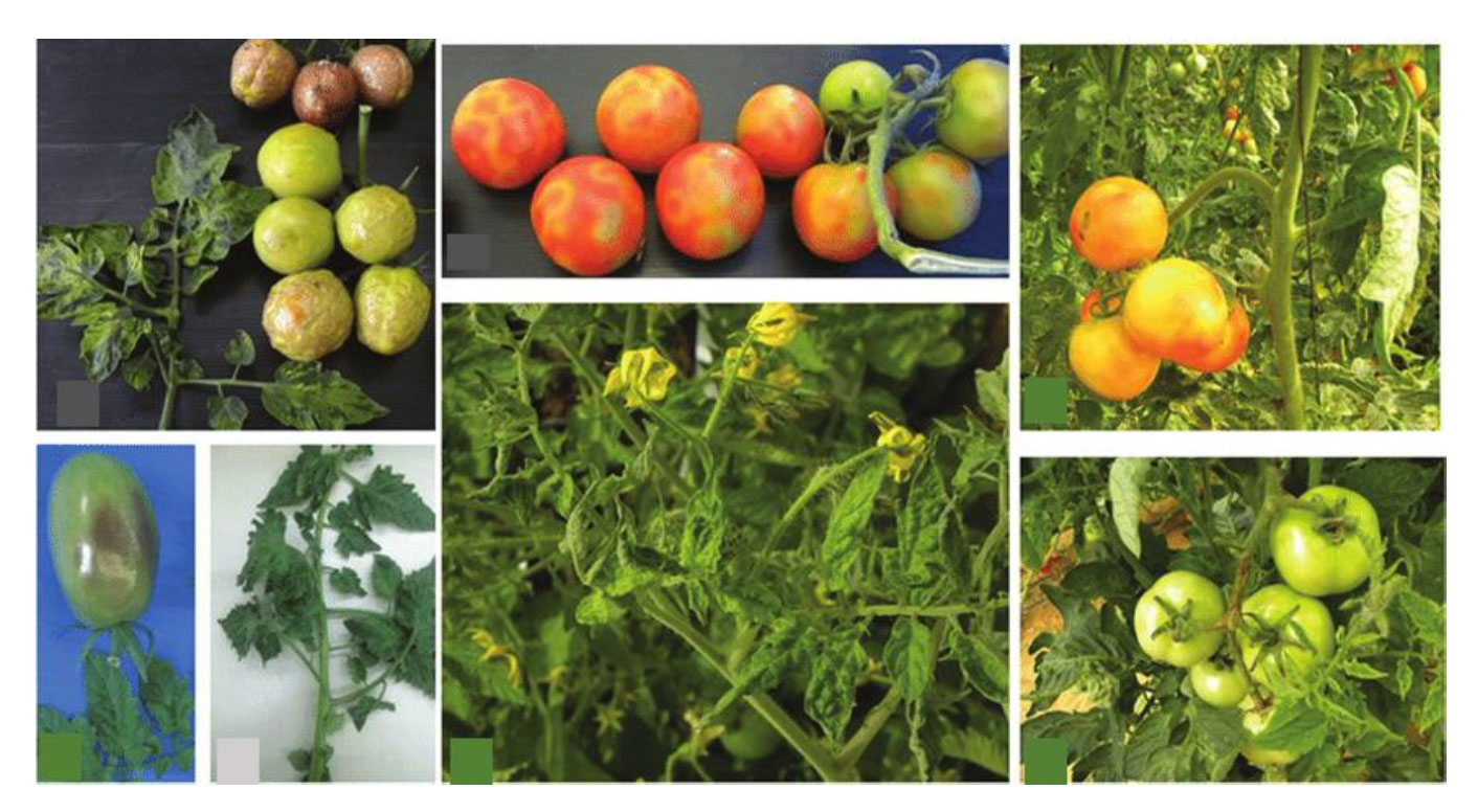 Τα συμπτώματα εμφανίζονται στα φύλλα, στελέχη και τους καρπούς. Τα συμπτώματα στα φύλλα περιλαμβάνουν χλώρωση, μωσαϊκό, ποικιλoχλώρωση, κατσάρωμα, παραμόρφωση του ελάσματος και περιστασιακά στένωση. Νεκρωτικές κηλίδες μπορεί να εμφανιστούν σε ποδίσκους, κάλυκες και μίσχους. Οι καρποί εμφανίζουν κίτρινους ή καστανούς δακτυλίους, καστανές περιοχές και ρυτίδωση, όπως επίσης παραμορφώσεις και ανομοιόμορφη ωρίμανση (Εικόνα 1). Τα ασθενή φυτά παρουσιάζουν μειωμένη ανθοφορία και καρπόδεση. Η μείωση της παραγωγής κυμαίνεται από 30 έως 70%. Στην πιπεριά, τα συμπτώματα στα φύλλα περιλαμβάνουν παραμορφώσεις του ελάσματος, κιτρινίσματα και μωσαϊκό. Οι καρποί της πιπεριάς εμφανίζουν παραμορφώσεις, ανομοιόμορφο χρωματισμό με κίτρινες και καστανές περιοχές και πράσινες ραβδώσεις.