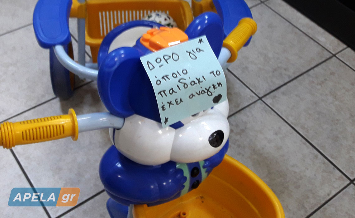 Μάλιστα, επάνω στο ποδηλατάκι, είχε τοποθετηθεί ένα σημείωμα, στο οποίο ο άγνωστος δωρητής έγραφε: «Δώρο για όποιο παιδάκι το έχει ανάγκη».