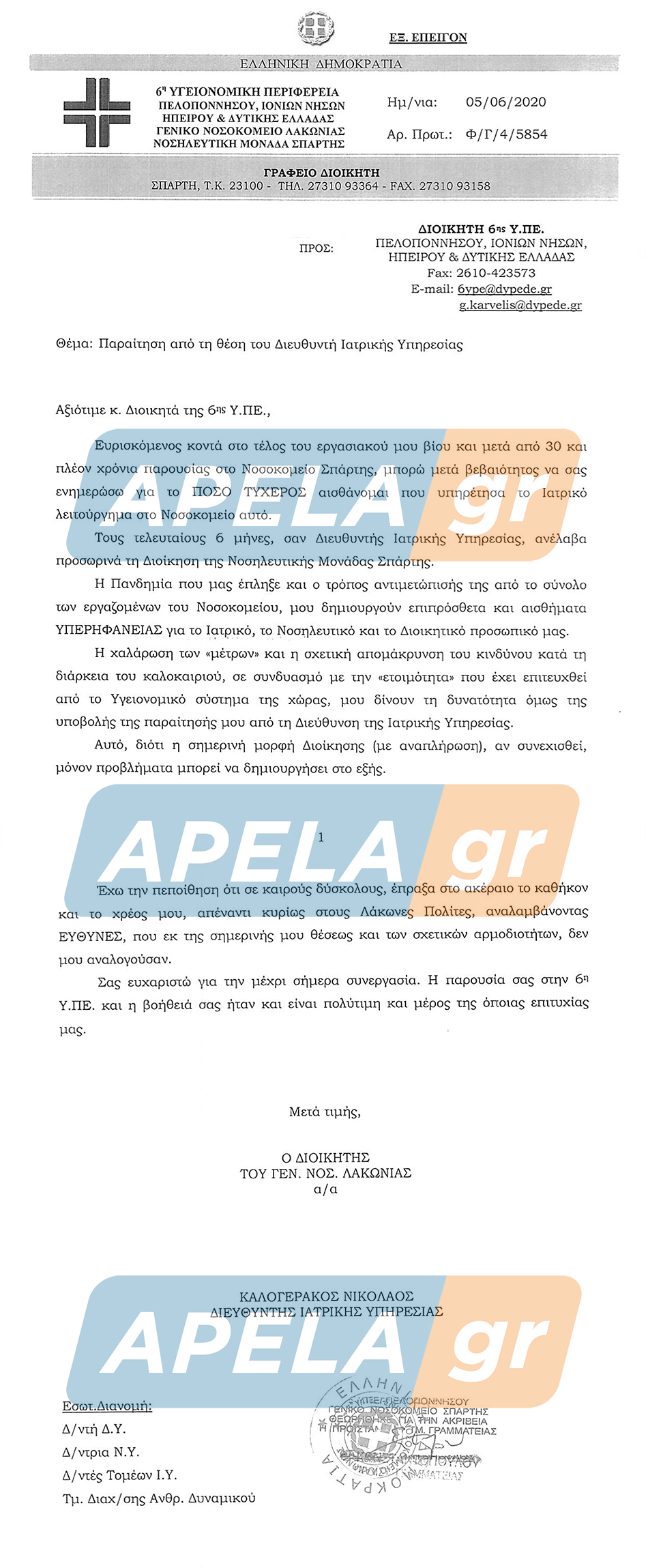 Δείτε παρακάτω το έγγραφο με την υποβολή της παραίτησης του κ. Καλογεράκου