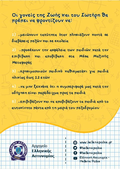 Πιο συγκεκριμένα, στους μαθητές δόθηκαν φυλλάδια με συμβουλές, ώστε να μετακινούνται με ασφάλεια από και προς το σχολείο, ενώ οι γονείς ενημερώθηκαν σχετικά με την κυκλοφοριακή αγωγή και τους βασικούς κανόνες του Κώδικα Οδικής Κυκλοφορίας».