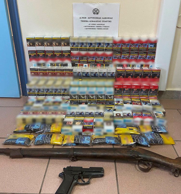Συνελήφθησαν το πρωί της Τετάρτης 16 Σεπτεμβρίου, στη Νεάπολη και στους Αγίους Αποστόλους του Δήμου Μονεμβασίας, από αστυνομικούς, του Τμήματος Ασφάλειας Σπάρτης, της Ομάδας Πρόληψης και Καταστολής Εγκλήματος (Ο.Π.Κ.Ε.) Λακωνίας και των Αστυνομικών Τμημάτων Βοιών και Γυθείου, έξι Έλληνες, ηλικίας από 41 έως 66 ετών και ένας 52χρονος αλλοδαπός, γιατί σε έρευνες που έγιναν στις οικίες τους βρέθηκαν συνολικά και κατασχέθηκαν, 395 πακέτα λαθραίων τσιγάρων, 10 συσκευασίες λαθραίου καπνού, βάρους 50 γραμμαρίων έκαστη, πολεμικό τυφέκιο παλαιού τύπου και πιστόλι απομίμησης (REPLICA).