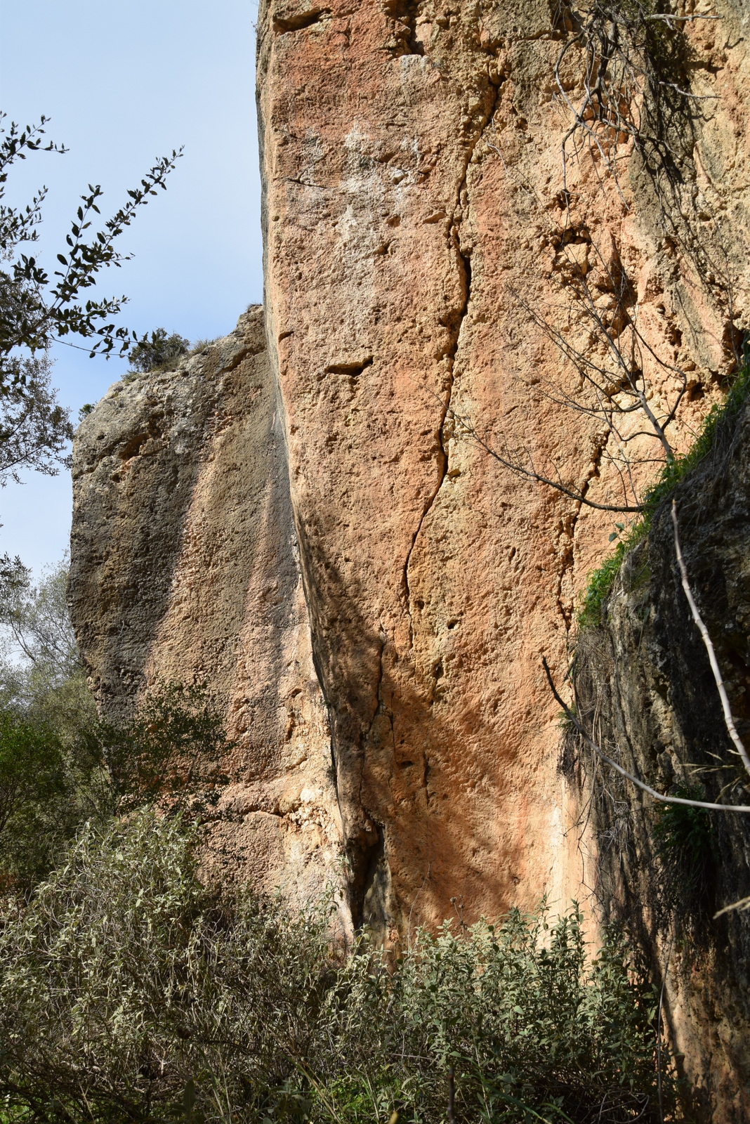 Το πρανές του βουνού με θέα το ποτάμι είχε σχολαστικά κοπεί και μετατραπεί σε πλάτωμα για να στεγάσει και να υποστηρίξει τις στήλες. Οι βραχοτομές βρίσκονται στη νότια όψη του βουνού σε εναλλασσόμενες κάθετες παραστάδες και κόγχες. Οι στήλες αυτές ήταν ένα μοναδικό αρχαιολογικό μυστήριο στην αρχαιότητα. Στην πραγματικότητα ήταν δύο οβελίσκοι από 15 με 16 μέτρα σε ύψος, οι οποίες στην πρωτογεωμετρική περίοδο ανεγέρθηκαν στο ιερό (τεμένους) του Απόλλωνα Πυθαέως μπροστά από την πόλη της Σπάρτης. Εκεί υπήρχε ο λεγόμενος «Θόρναξ εν πεδίω», στον οποίο στρατοπέδευσε ο Επαμεινώνδας που αναφέρεται από τον Ξενοφώντα. Πιθανολογείτε πως οι στήλες αυτές είχαν στηθεί στην σημερινή είσοδο της Σπάρτης στο παλιό εργοστάσιο του ΧΥΜΟΦΙΞ. Αργότερα μία απ’ αυτές τις στήλες την πήραν οι Λακεδαιμόνιοι και την πήγαν στις Αμύκλες και τοποθετήθηκε στο κτίσμα που κατασκεύασε ο αρχιτέκτονας Βαθυκλής από την Μαγνησία.