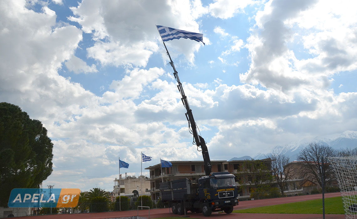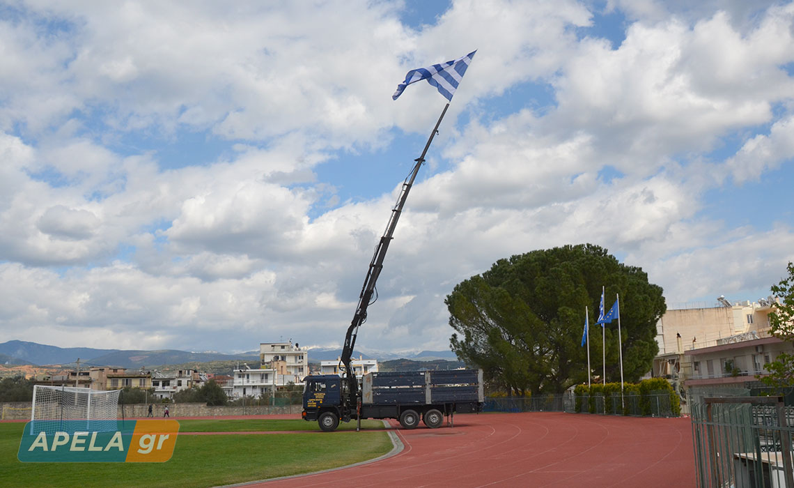 Μια μεγάλη ελληνική σημαία υψώθηκε το μεσημέρι της Τρίτης 24 Μαρτίου, εντός του Δημοτικού Σταδίου Σπάρτης, από γερανοφόρο όχημα.