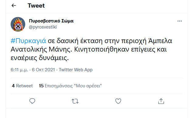 Σύμφωνα με ανάρτηση του Πυροσβεστικού Σώματος «κινητοποιήθηκαν επίγειες και εναέριες δυνάμεις».