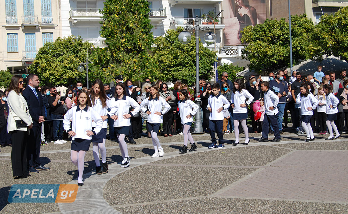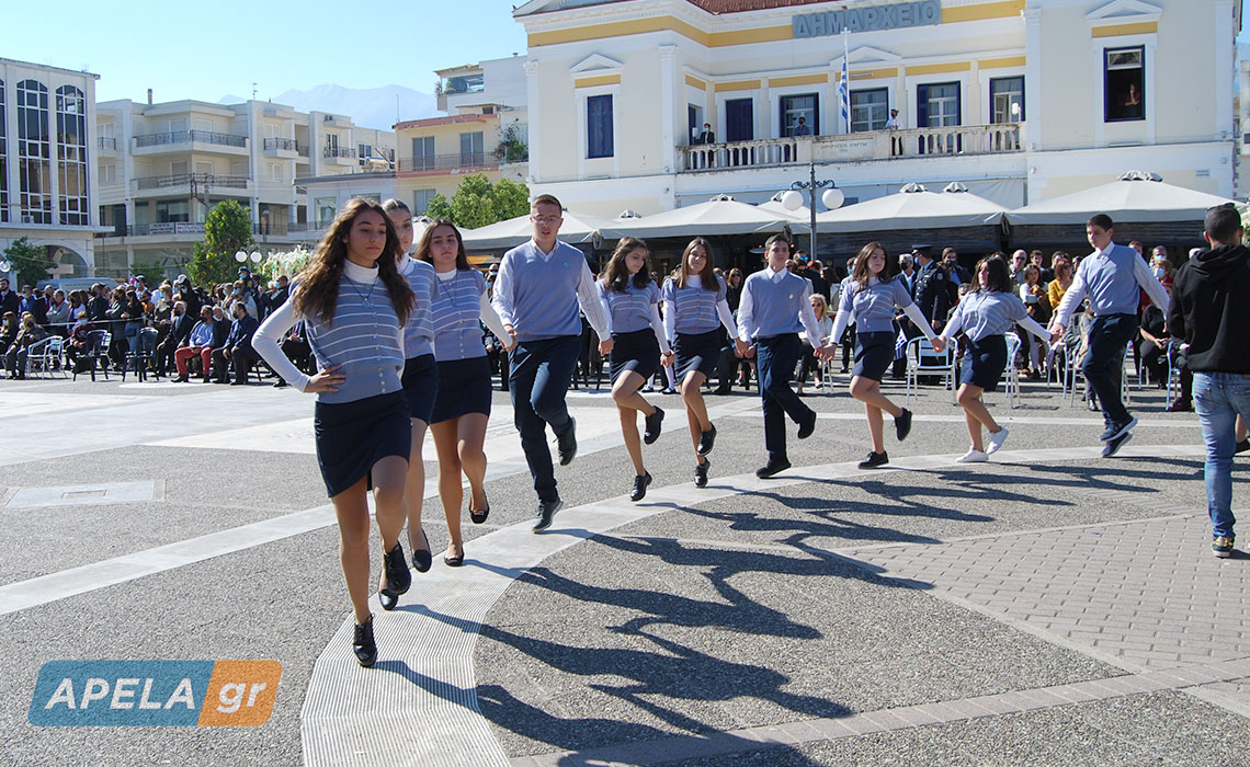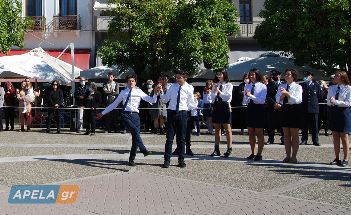 Στη συνέχεια, στην κεντρική πλατεία της λακωνικής πρωτεύουσας, έλαβαν χώρα οι χορευτικές εκδηλώσεις, στις οποίες συμμετείχαν κατόπιν κληρώσεως, το 3ο και το 5ο Δημοτικό, το 2ο Γυμνάσιο και το 3ο Λύκειο.