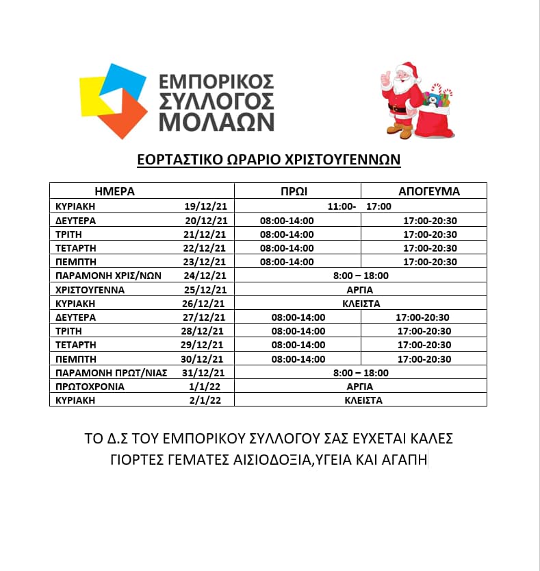 Δείτε το εορταστικό ωράριο των καταστημάτων των Μολάων