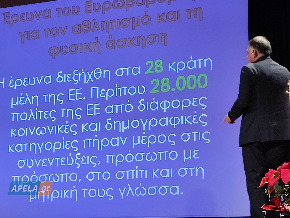 Βασίσθηκε στην Έρευνα του Ευρωβαρομέτρου για τον αθλητισμό και τη φυσική άσκηση, προκειμένου να αναλύσει στη συνέχεια τον παράγοντα Υγεία και Άθληση. Εξήγησε αναλυτικά γιατί η άθληση πρέπει να αποτελεί αναπόσπαστο κομμάτι της καθημερινότητας, αφού τα οφέλη της για την υγεία του ανθρώπου είναι πολλαπλά. Αναφέρθηκε στην ενότητα Άθληση και μυοσκελετικό σύστημα, παρουσιάζοντας στοιχεία τα οποία αποδείκνυαν πως η άθληση είναι πολλαπλά ωφέλιμη για την υγεία μας, έχοντας θετική επίδραση στο μυοσκελετικό, το κυρίαρχο σύστημα για την κίνηση του ανθρώπινου σώματος. Έδωσε παραδείγματα και ανέλυσε πως με την ένταξη της άθλησης στη ζωή μας σε καθημερινή βάση όχι μόνο ενδυναμώνουμε μυϊκά το σώμα μας, αλλά και προσδίδουμε στον οργανισμό πολλά και σημαντικά  οφέλη, αφού η άθληση: