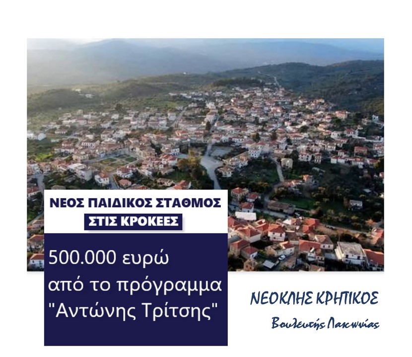 Όπως γνωστοποιείται σε ανακοίνωση από το γραφείο του βουλευτή Λακωνίας, Νεοκλή Κρητικού, «Υπεγράφη από τον Αναπληρωτή Υπουργό Εσωτερικών κ. Στέλιο Πέτσα χρηματοδότηση με 500.000 ευρώ για το έργο δημιουργίας νέου παιδικού σταθμού στις Κροκεές, το οποίο είχε καταθέσει ο Δήμος Ευρώτα προς έγκριση στο πρόγραμμα "Αντώνης Τρίτσης"».