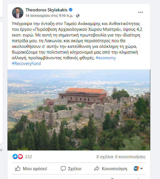΄΄Υπέγραψα την ένταξη στο Ταμείο Ανάκαμψης και Ανθεκτικότητας του έργου «Πυρόσβεση Αρχαιολογικού Χώρου Μυστρά», ύψους 4,2 εκατ. ευρώ΄΄ σημείωσε σε ανάρτησή του στο διαδίκτυο στις 14/01, ο αναπληρωτής υπουργός Οικονομικών, Θεόδωρος Σκυλακάκης.