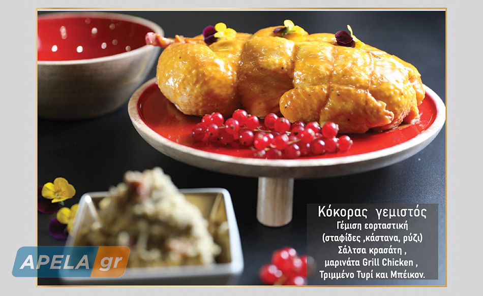 Κόκορας γεμιστός: Γέμιση εορταστική (Σταφίδες, Κάστανα, Ρύζι), Σάλτσα κρασάτη, Μαρινάτα Grill Chicken, Τριμμένο Τυρί και Μπέικον.