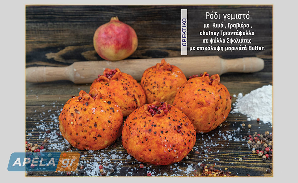 Ρόδι γεμιστό (ορεκτικό): Με κιμά, γραβιέρα, chutney τριαντάφυλλο, φύλλο σφολιάτας και επικάλυψη μαρινάτα Butter.