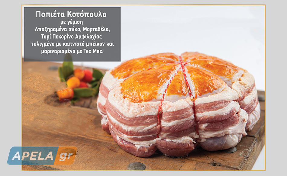 Ποπιέτα Κοτόπουλο: Με γέμιση αποξηραμένα σύκα, Μορταδέλα, Τυρί Πεκορίνο Αμφιλοχίας τυλιγμένο με καπνιστό μπέικον και μαριναρισμένο με Tex Mex.