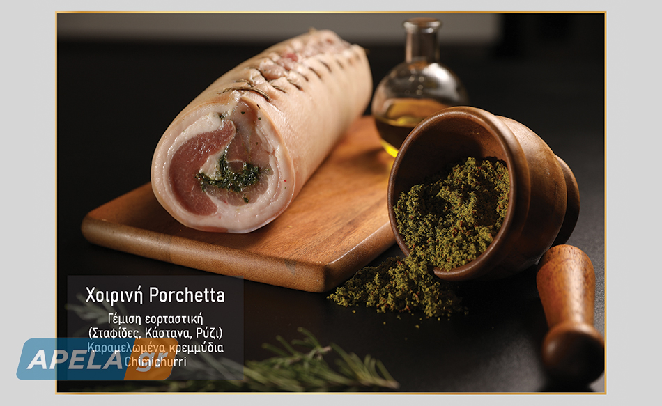 Χοιρινή Porchetta: Γέμιση εορταστική με σταφίδες, κάστανα, ρύζι, καραμελωμένα κρεμμύδια και chimichurri.