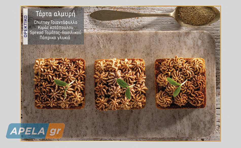 Τάρτα αλμυρή: Chutney τριαντάφυλλο, Κιμά κοτόπουλου, Spread Τομάτας-Βασιλικού και Πάπρικα γλυκιά.