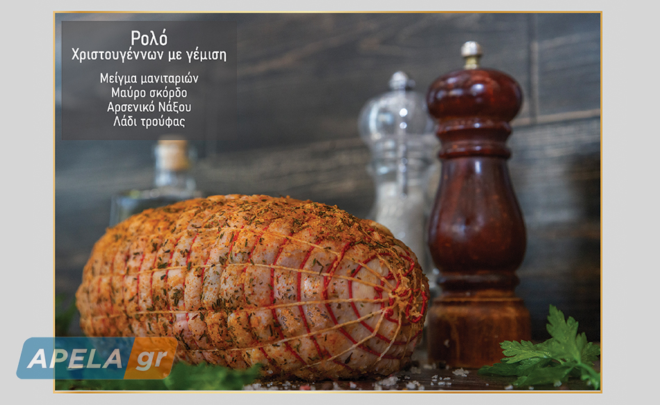 Ρολό Χριστουγέννων με γέμιση: Με μείγμα μανιταριών, μαύρο σκόρδο, Αρενικό Νάξου και λάδι τρούφας.