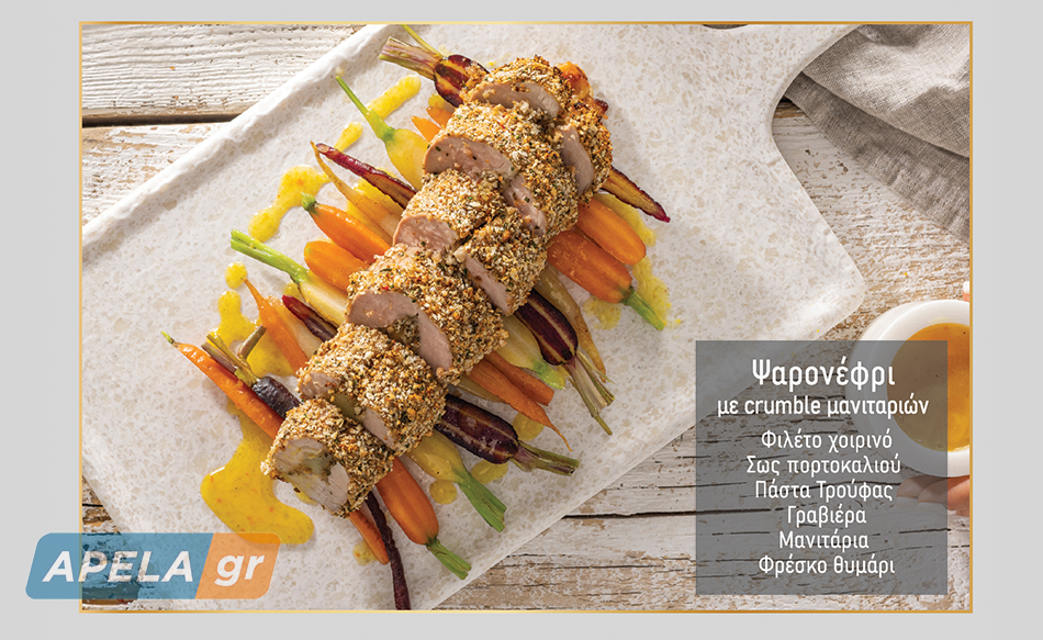 Ψαρονέφρι με crumble μανιταριών: Φιλέτο χοιρινό με σάλτσα πορτοκαλιού, πάστα τρούφας, γραβιέρα, μανιτάρια και θυμάρι.
