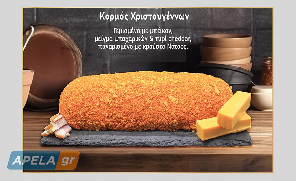 Κορμός Χριστουγέννων: Γεμισμένο με μπέικον, μείγμα μπαχαρικών και τυρί cheddar, παναρισμένο με κρούστα Nάτσος.